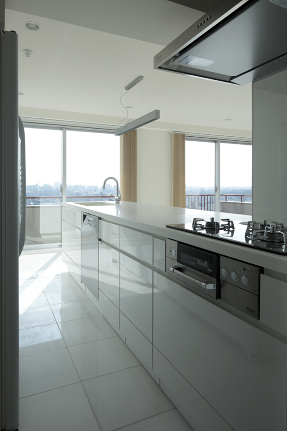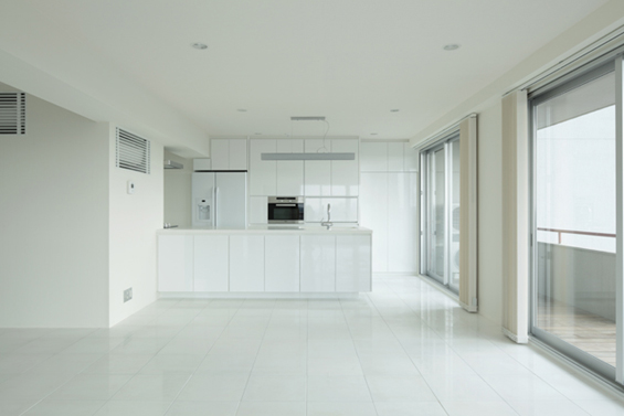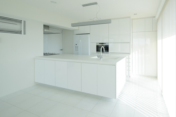 ①内装は白にこだわりました。光沢のある床・キッチンも白一色です。②窓から入るたっぷりの光が、白い壁や床に反射してさらに広がります。